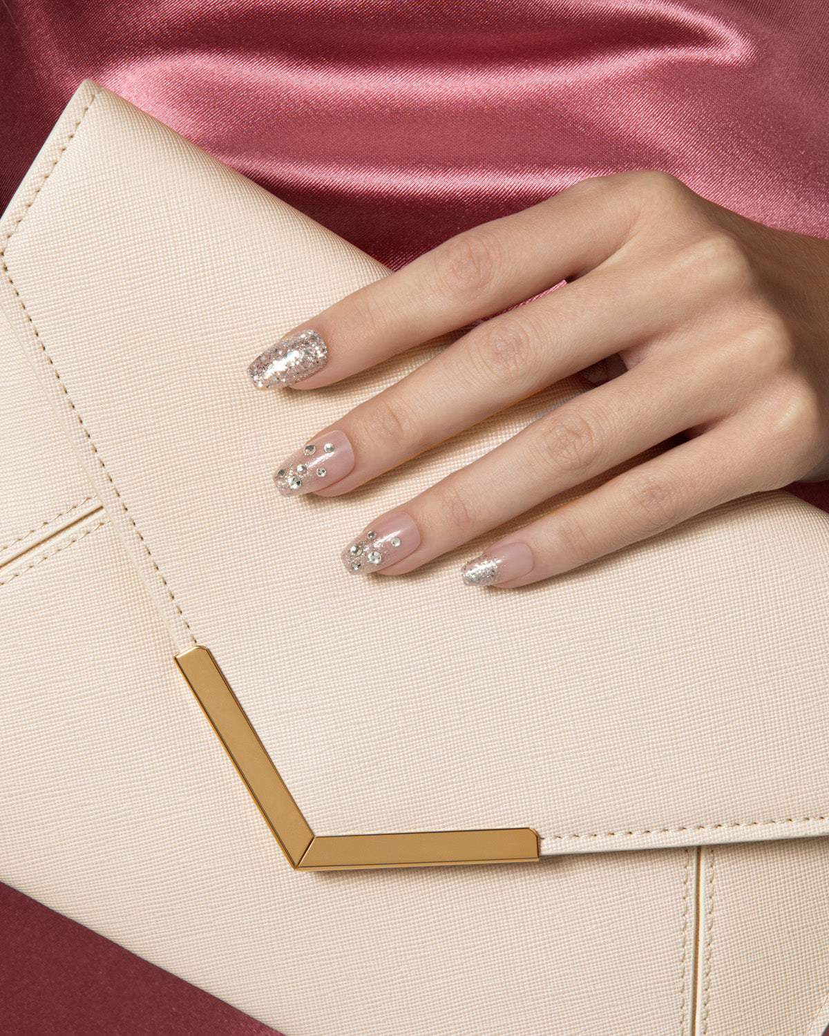 - On-trend premium natural fashion nails are medium length & coffin shaped, bejeweled with rhinestones & glitter